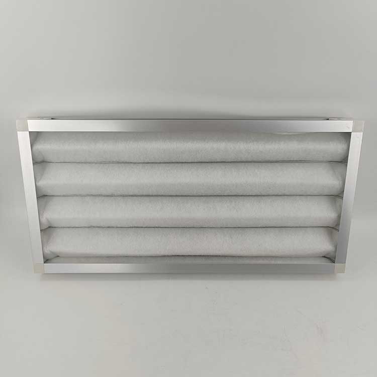 板框空氣過濾器在填充濾材前,先將一層鍍鋅鐵網(或不銹鋼網)貼合在濾材的出風面上,待填入濾材后,再蓋上一層鍍鋅鐵網(或不銹鋼網),這兩層鐵網不但能保護濾材不被吹破,亦能防止濾材因風壓力而造成變形,故能確保所有濾材表面皆能被充分利用。